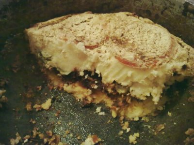 слой толченой картошки, соленых огурцов, помидорок свежих,