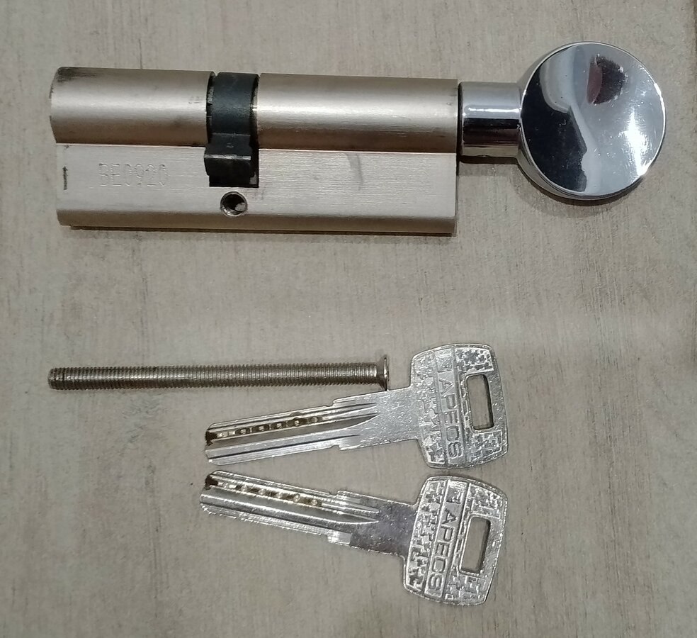 Цилиндр (личинка) замка. Тяжёлый. Б/у, работает без нареканий. 2 ключа и болт для крепления в комплекте. Размер от вертушки 40*10*30 мм. 300 руб.