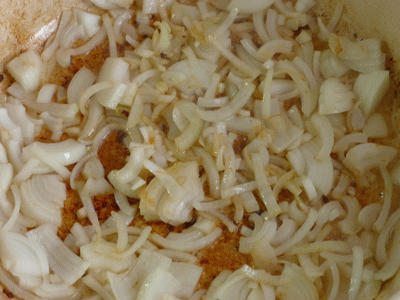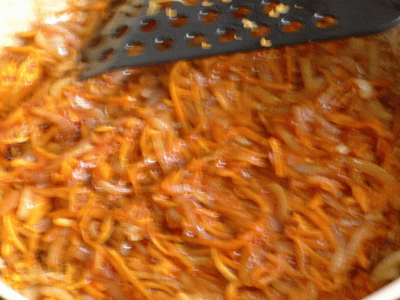 Потом мясо убрала, на оставшемся масле лук потомила до мягкости. На среднем огне.