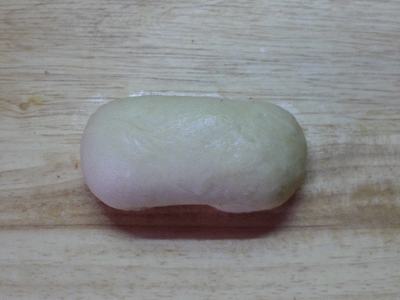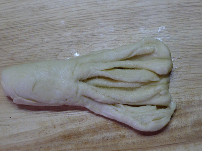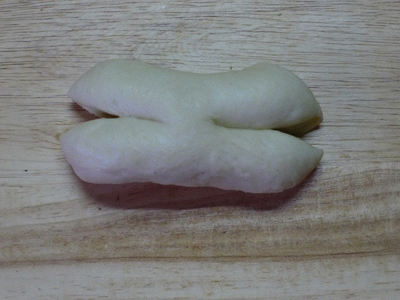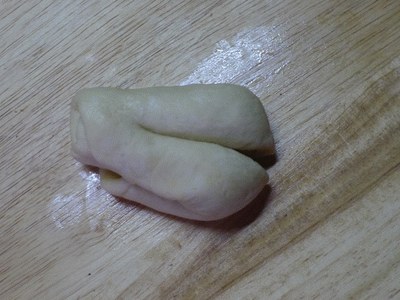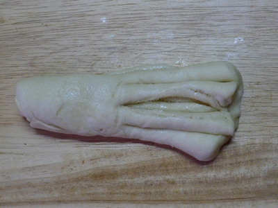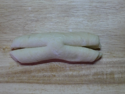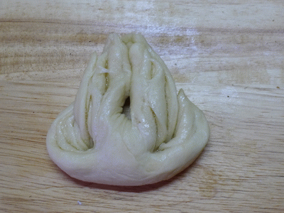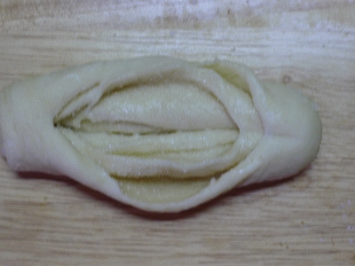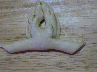 Рулетик швом вниз. Делаем с двух концов два разреза. Верхние кончики соединяем наверху. Нижние кончики, выворачивая, поднимаем и кончики прячем под верхние "лепестки.