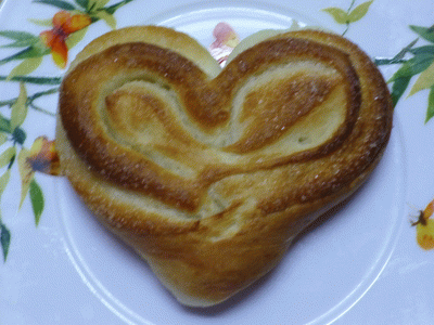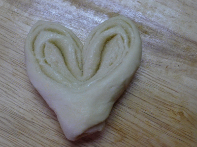 Рулетик швом внутрь складываем пополам со стороны сгиба делаем сквозной разрез. Разворачиваем половинки сердечка.