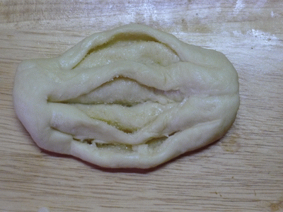 Отрезать кусочки в 3-4 см толщиной. С одной стороны тщательно залепливаем срезы (чтобы масло с сахаром не текло на противень). С другой стороны чуть расправляем "розочку". Кладем булочки на смазанный жиром противень защипом вниз.