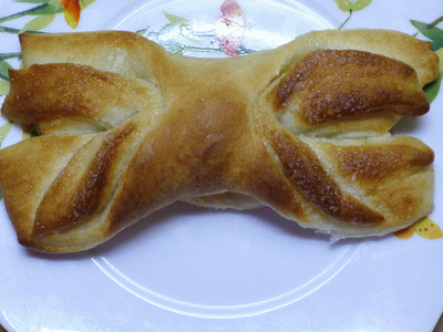 Тесто было лентовское в рулете. Посыпала сахаром и корицей и завернула тесто в рулетик с двух концов до середины.