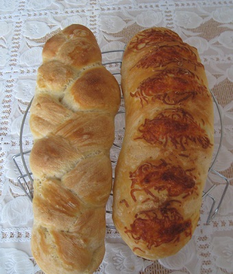 7. Делю на 2 части и разделываю из каждой части батоны. Первый батон - просто разрезала тесто на 3 куска и сплела косичкой. Второй - сделала из теста лепешку, свернула рулетом, вытянула в прямоугольник, глубоко прорезала наискосок.