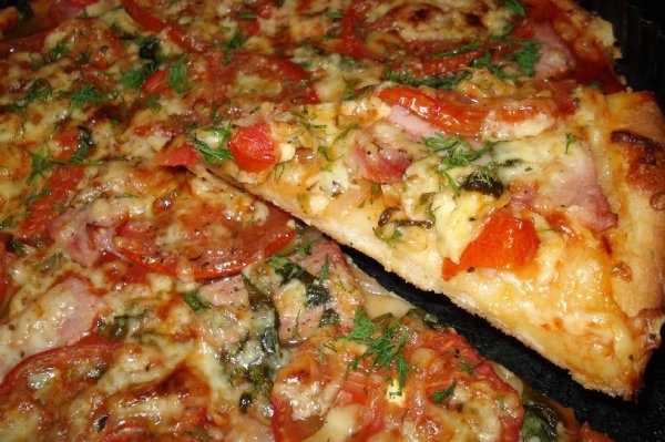 mamma_mia посмотрела вчера на вашу пиццу-сегодня пицца с ветчиной, 2 сырами, помидорки и добавила немного молодого шпината:-)