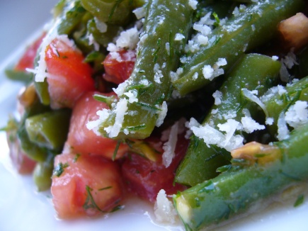 К фасоли добавляем помидоры, масло с зеленью, уксус. Солим. Посыпаем сыром. Перемешиваем.