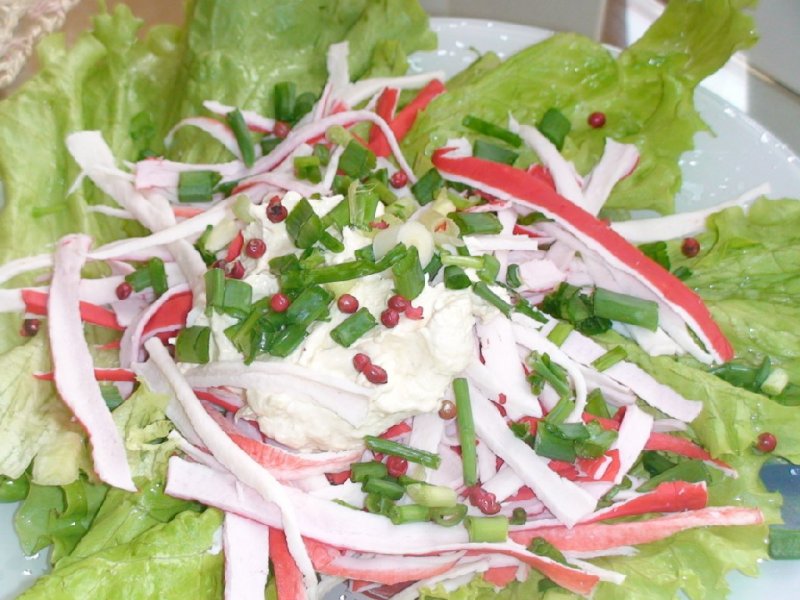 Крабовые палочки разобрать на волокна. Лук нарезать мелко. Выложить листья салата на тарелки, в центр на листья положить волокна крабовых палочек, полить заправкой, присыпать зеленым луком и розовым перцем.