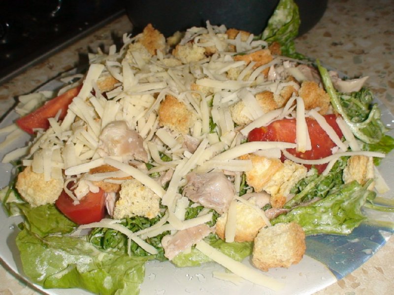 Курочку отварить и разобрать на волокна. Выложить листья салата на тарелку, сверху положить немного крутонов, куриное мяско, присыпать пармезаном._________________ Детки: сынуля Димоша (2003) и дочечка Юлечка (2008) |