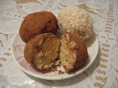12. Смешиваю 1 ч.л. какао-порошка и 1 ч.л. ванильной сахарной пудры. Обваливаю "картошки" в этой смеси (один обваляла в кокосовой стружке). Ставлю в холодильник постоять.