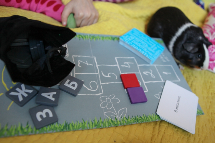 а что именно? я вроде все написала. И на картинки видно, есть карточки и фишки с буквами. Тащишь и ответив, передвигаешься на клетку. :oops: