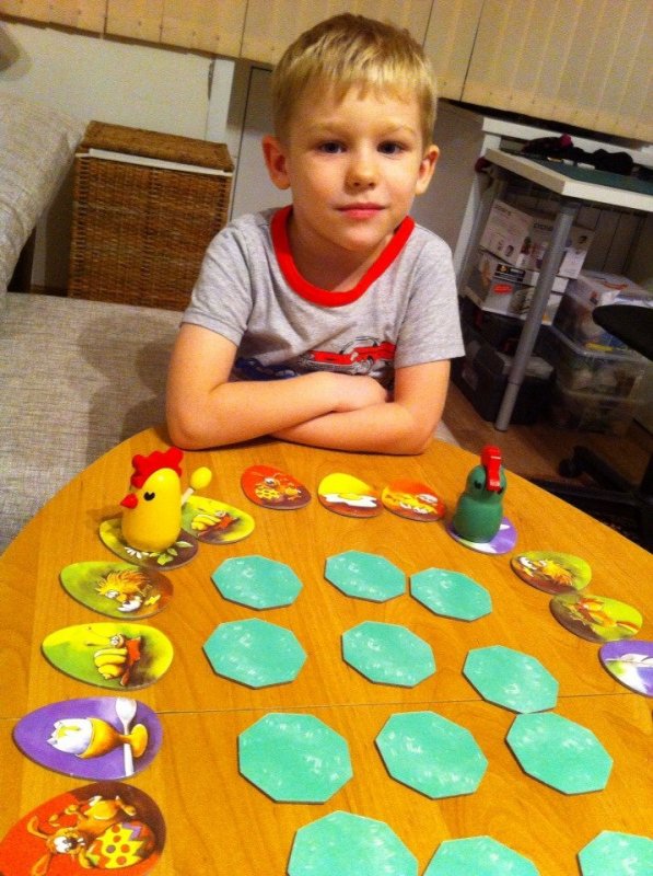 с изображением карточки на беговой дорожке (перед его цыпленком), то цыпленок может сделать шаг вперед на эту карточку. Восьмиугольная карточка после этого переворачивается рубашкой вверх и кладется на то же место двора, откуда она была взята. Игрок не заканчивает на этом свой ход, а продолжает перемещать своего цыпленка, пока он может находить карточки во дворе, совпадающие с соответствующими карточками беговой дорожки. Если игрок ошибся и открыл не совпадающую карточку, то его цыпленок не совершает шаг и остается на своем месте, а право хода переходит к следующему игроку по часовой стрелке. Догнав соберника, забираем у него все перья из хвоста.
