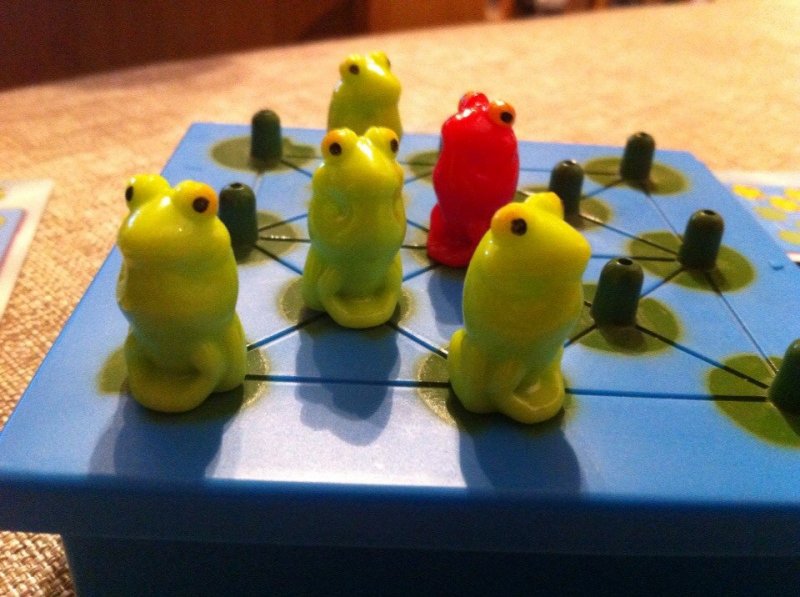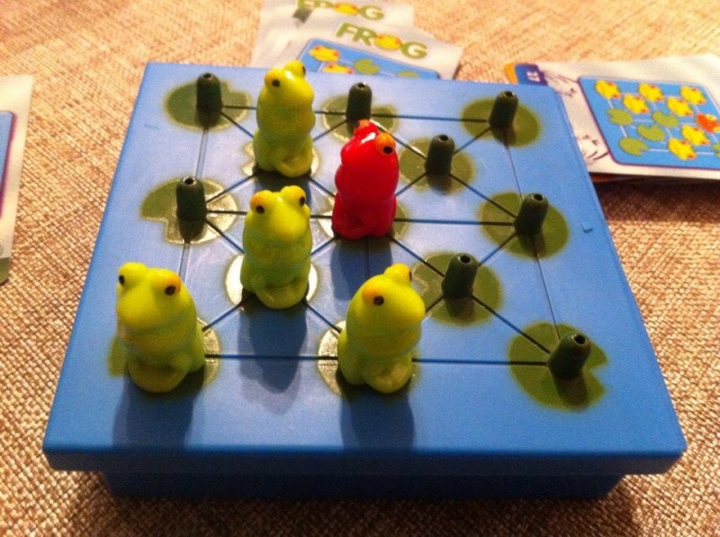 Принцип игры гениально прост, а вот решение поставленных задач потребует от вас самого серьезного отношения. В наборе есть карточки-задания, которые определяют расстановку лягушек на игровом поле, напоминающем шахматную доску. Задача игроков — управлять лягушками так, чтобы в конце игры на поле осталась только красная лягушка. Перемещение лягушек подчиняется ряду правил. Во-первых, лягушки могут перепрыгивать только через других лягушек. В этом случае лягушка, через которую перепрыгнули, удаляется с игрового поля. Во-вторых, лягушки не могут перепрыгивать через пустые клетки и могут прыгать только в одном направлении. Эти два простых принципа передвижения порой создают на игровом поле настоящие головоломки. Сложность игры зависит от карточки-задания. В игре есть как очень простые расположения лягушек для детей, так и более сложные и запутанные для взрослых. P.S. Есть ответы головоломок.