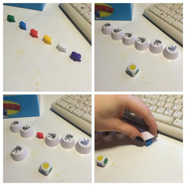 Берется 6 разноцветных слоников, слоники накрываются колпачками. Остальные слоники и колпачки раздаются играющим поровну. Кидаем кубик и вспоминаем под каким колпачком находится слоник искомого цвета. Далее игрок поднимает один из 6-ти колпачков. Если под ним нужный слоник, колпачок выбывает из игры, а фигура становится возле отгадавшего участника. Если выбран неверный колпачок, т.е. под ним находится слоник другого цвета, необходимо поставить своего слоника из «запаса», накрыв одним из своих колпачков. Конец игры: либо когда заканчиваются слоники выставленные на середину (тогда победитель определяется путем подсчета слонов, у кого больше тот и победил), либо когда у одного из игроков заканчиваются его личные колпачки (или по договоренности пока не останется последний игрок).
