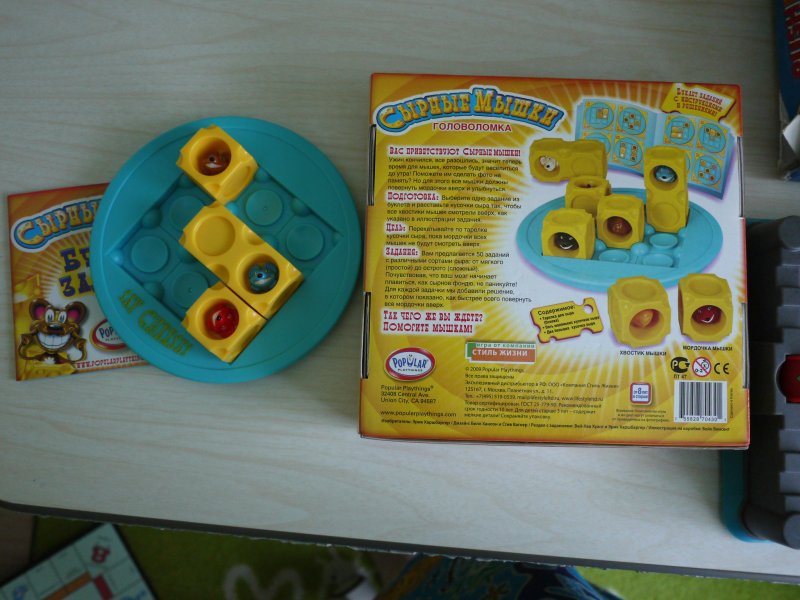 о них подробно написано ранее, немного подробнее о мышках: качество супер, очень милые и приятные, игра что-то вроде пятнашек или час пик, есть карточки с заданиями и надо перекатывать мышек чтобы были мордочками вверх