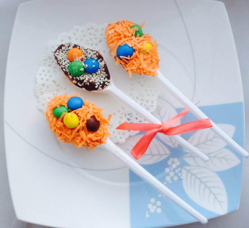Нам понадобяться конфеты, шоколад, одноразовые ложки и то, что вам больше нравиться: кокосовая стружка, кунжут или, как у нас шоколадная стружка(соломка). Оранжевая шоколадная соломка со вкусом апельсина!
