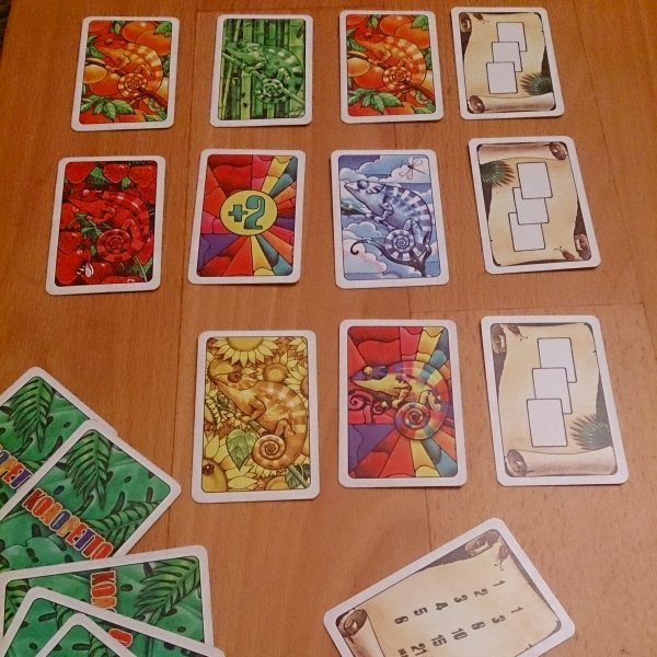 На карточках иллюстрации с хамелеонами. Есть несколько бонусных карт.