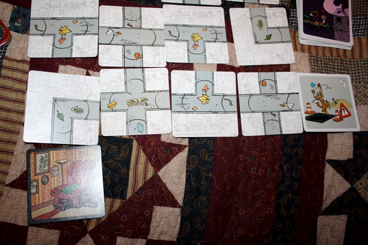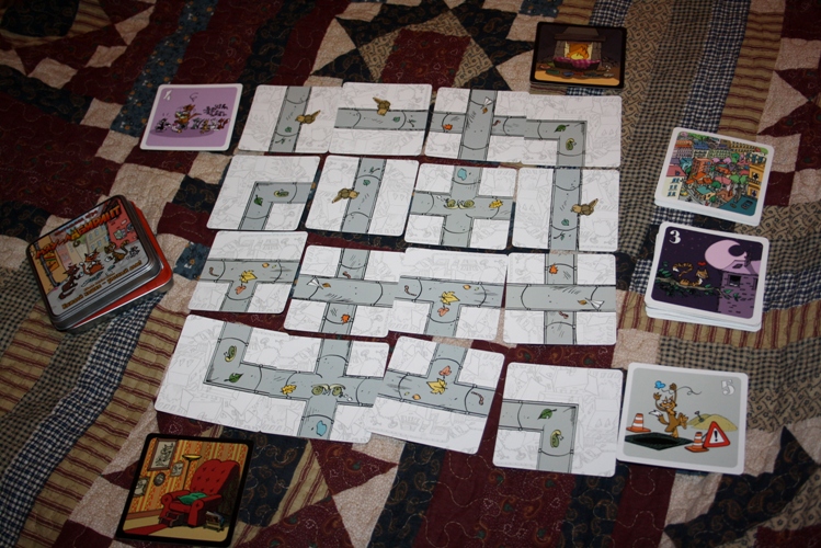 Карточки с трубами раскладываются квадратом 4х4 (можно упрощенный вариант для детей 3х3). По периметру квадрата установленным образом размещаются карточки Уютного Дома и карточки Бродячих Кошек. Цель игры - меняя по правилам расположение карточек с трубами (переставляя и поворачивая) проложить для Бродячих Кошек путь в Уютный Дом
