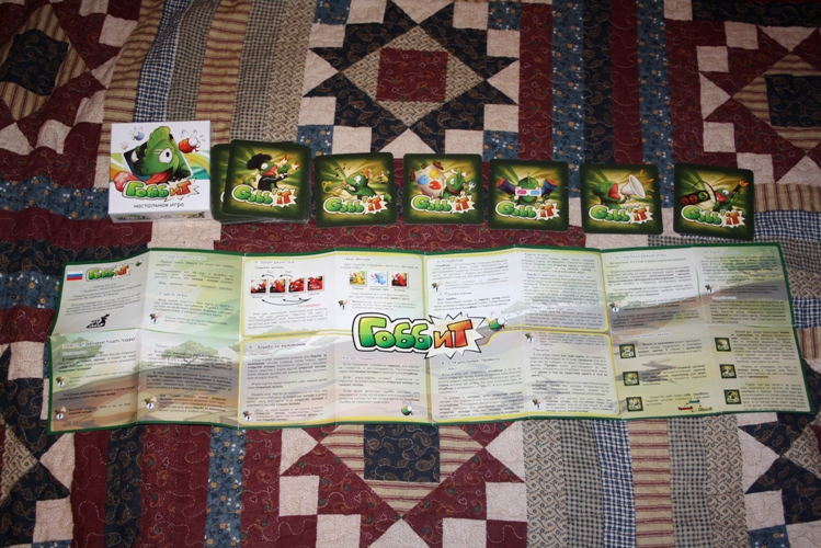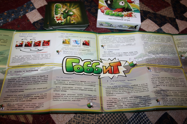 Дальше самая фишка Если одновременно оказываются открыты карточки с мухитами всех трех цветов, нужно кричать "ГОББИТ" и быстро положить руку на кладбище. Тот кто положил руку последним, отдает свою открытую колоду тому, кто положил первым. Игра при этом останавливается, никто никого уже не может съесть.