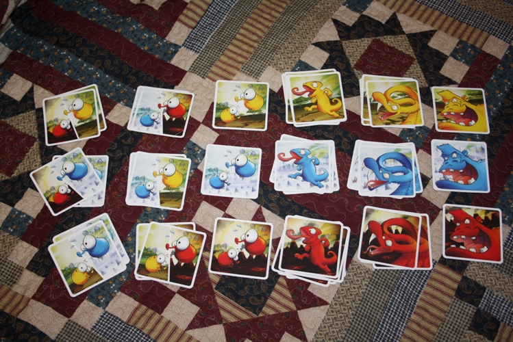 На картах изображены мухиты, хамелеоны, змеи и гориллы 4х цветов. Играют по принципу камень-ножницы-бумага. Змеи едят хамелеонов, хамелеоны мухитов, гориллы расплющивают всех. Мухиты никого не едят. Есть и расплющивать можно только существ такого же цвета. Мухиты всегда летают по двое, если они разных цветов, то могут стать жертвой хищников этих цветов.