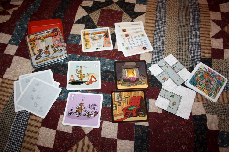 Жестяная коробочка, карточки с водосточными трубами, Бродячими Кошками и 2 карты Уютный Дом. Правила тоже на карточках.