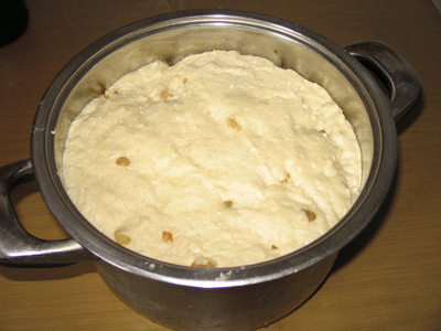 В просеянную муку добавила соль, оставшийся сахар, слегка взбитые вилочкой яйца, протертый творог, оставшееся молоко, мягкое масло, ванильную эссенцию. Вымешивала тесто минут 5-7 руками. Потом добавила сухой изюм и еще минут пять вымешивала. Тесто прямо настоящее куличное: в ком не собирается, растекается по дну кастрюли. К рукам липнет, да )) Поэтому руки тщательно очищаем и ставим емкость с тестом в теплое место для подхода.