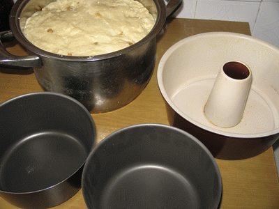 "Ого, сколько теста!" - подумала я. И достала три формы: две диаметром 18 см и одну для кугельхопфа (с трубкой посередине).