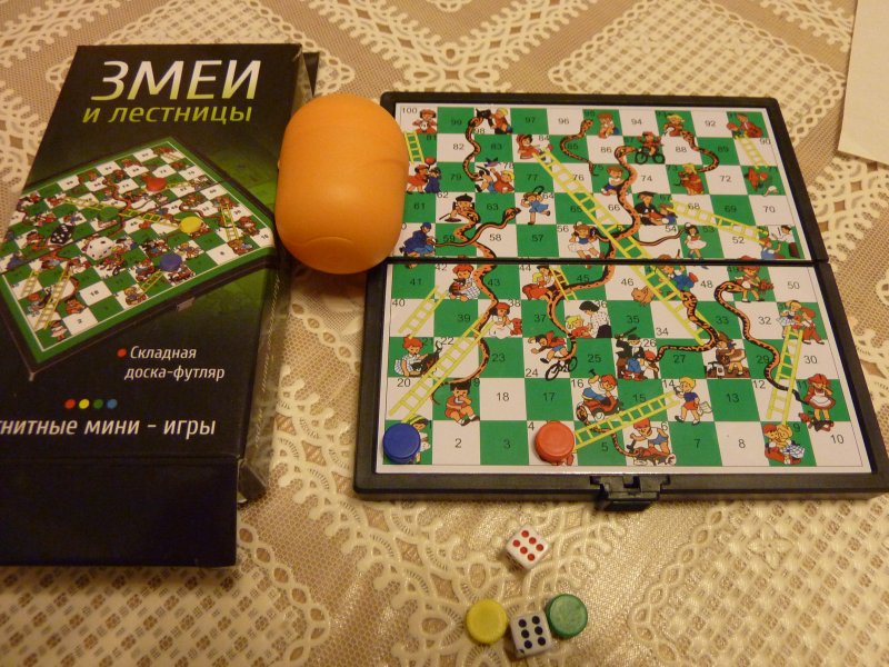 Ой какая миниатюрная игра со змеями, у нас она в напольном варианте есть, где коврик размером с ребенка :-)