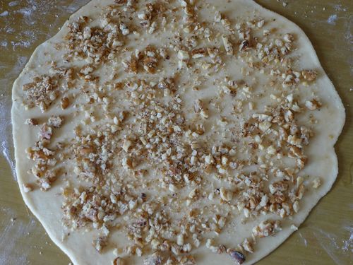 Готовое тесто разделила на 2 части. Из каждой части раскатала круг (толщина теста примерно 3-4 мм). Крут смазала при помощи кисточки кленовым сиропом и густо посыпала орехами.