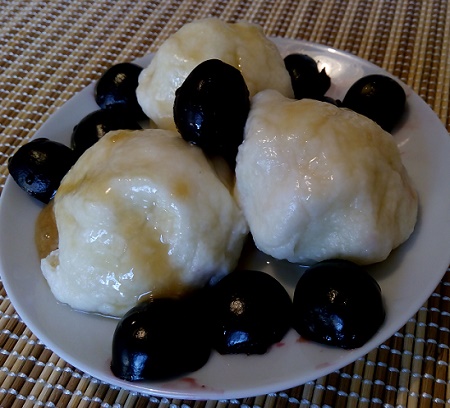 5. Опустила кнедлики в кипящую подслащенную воду и варила 5 минут. Поедать можно со сметаной, медом, вареньем и т.д. (у меня сверху свежий мёд):