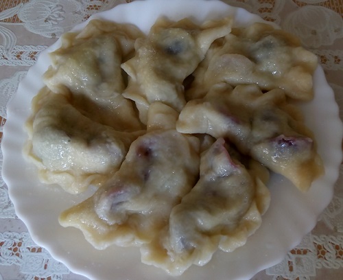 6. Кинуть вареники в кипящую воду, как всплывут - варить 2 минуты. Вытащить шумовкой, посыпать сахаром