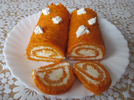 Этот рулет можно сделать в сладком варианте. В качестве крема возьмите творог, разотрите его блендером с сахаром или медом, добавьте размоченные сухофрукты кусочками, банан или яблоко - и вы получите потрясающе вкусный, очень полезный десерт к чаю. Он очень нравится ребятишкам и вкусом, и цветом!