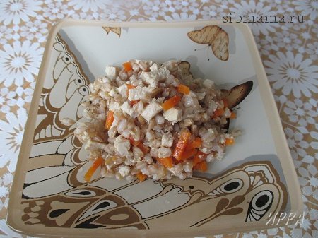 3. На сковороде в смеси сливочное масло/вода протушила немного лука и моркови, затем добавила куриный фарш и в последнюю очередь полбу. Протушила минут пять, плиту выключила, оставила настаиваться на горячей плите минут 10.