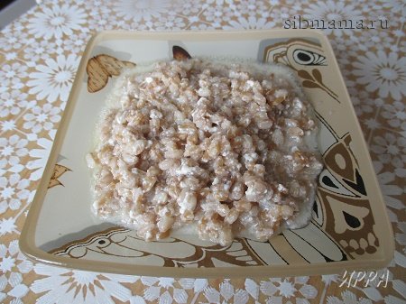 В традиционных русских рецептах пишут, что полбу нужно замочить на ночь в простокваше. Поэтому я промыла полбу в нескольких водах, залила ее простоквашей, закрыла емкость крышкой и поставила в холодильник.