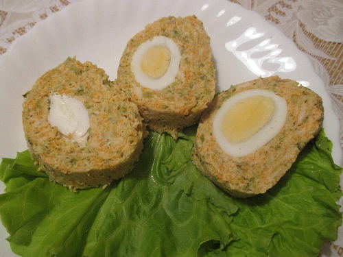 5. Поперек прямоугольника из фарша разложила вареные яйца. У меня они были всмятку, поэтому у них такая странная форма :haha: