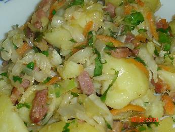 Но видно состояние здоровья сказываются и с клёцками я накосячила, пришлось выбросить. Но желание было столь велико, что не отказалась, а упростила вариант. Пожарила капусту маринованную (у меня пекинская) с окороком и зелёным луком, добавила отварной картофель. Вкуснота-а!