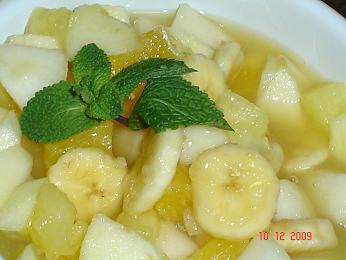 На десерт мачедония: фрукты, заправлены лимонным соком, сахаром и на этот раз абрикосовым ликёром.