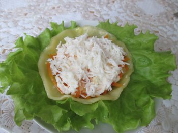3. На листья салата ставлю тарталетку и выкладываю в нее слоями: печень, сметана, рис, морковь с луком, сметана, белок.