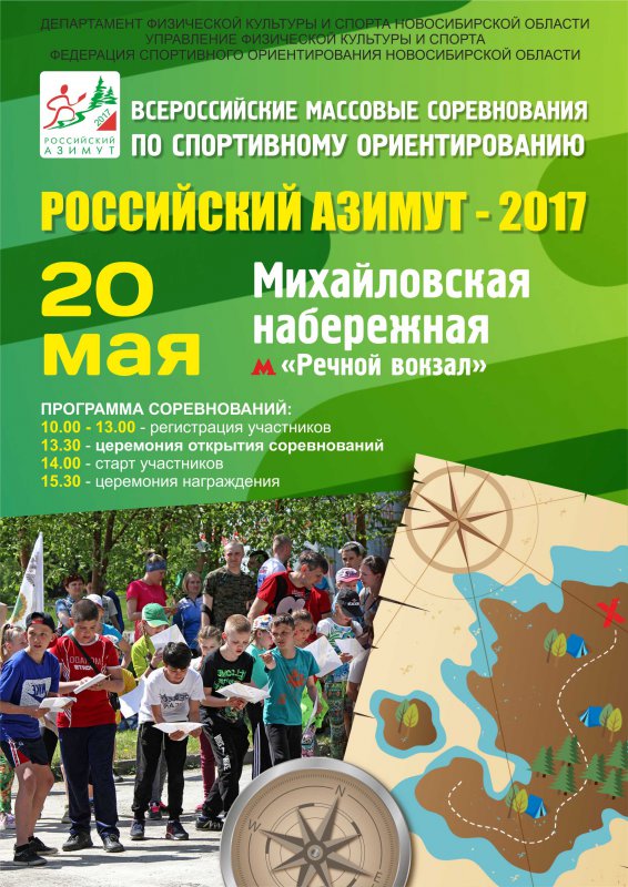 20 мая 2017 г. в Новосибирске на набережной реки Обь состоятся Всероссийские массовые соревнования по спортивному ориентированию «Российский Азимут». Это самые масштабные и многочисленные соревнования по спортивному ориентированию в мире. Они проводятся с 2006 года и собирают более 150000 опытных мастеров и просто любителей этого увлекательного вида спорта и активного отдыха в 73 регионах страны.