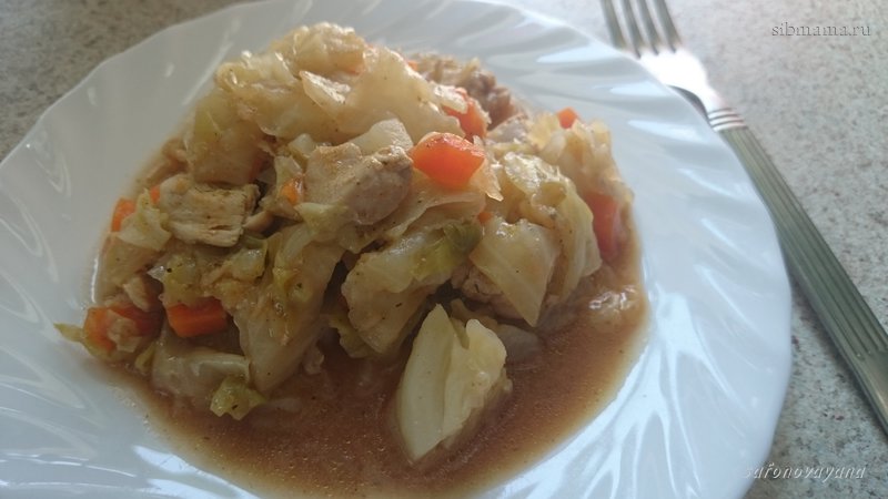Обжариваю в жаровне мясо, далее морковь кубиком и капусту крупно. Соль, приправы на вкус ( я люблю хмели сунели) и кетчуп (я беру Хайнц) чуть разбавляю водичкой и тушим до готовности.