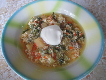 3. После чего положила в суп нарезанную ботву и брокколи, два пластика помидора. Прокипятила 5 минут, ввела разболтанное яйцо, еще пару минут подержала на плите, перемешивая содержимое и отставила.