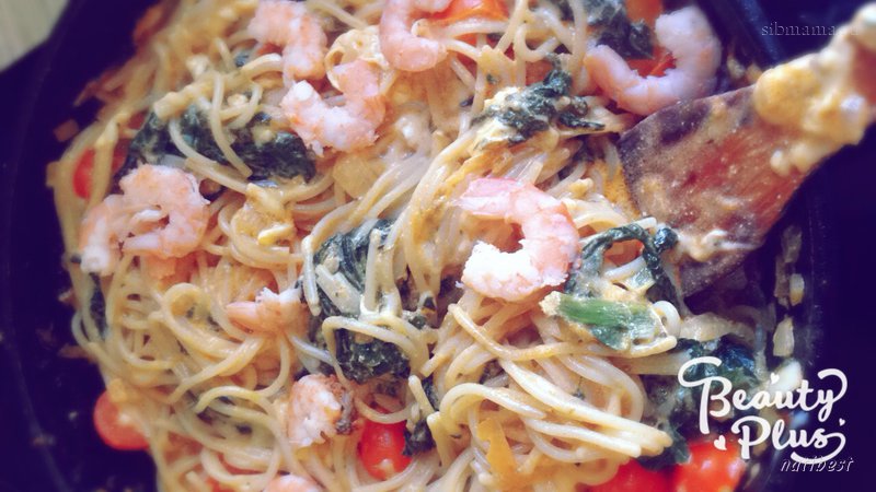 У нас на ужиной 🍝 паста с 🍤 креветками и шпинатом.