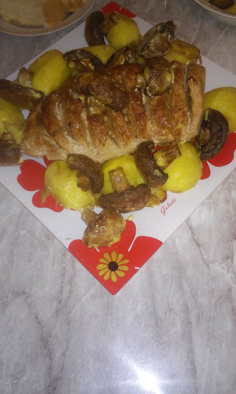 Буженина, картофель, шампиньоны. Все запекалось в духовке.