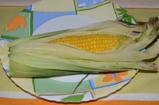 Кукурузный початок с листьями помыть, отрезать хвостик, листья не снимать. Отправить в микроволновку готовиться на полной мощности 5-6 минут. Получается вкусная сладкая кукуруза.