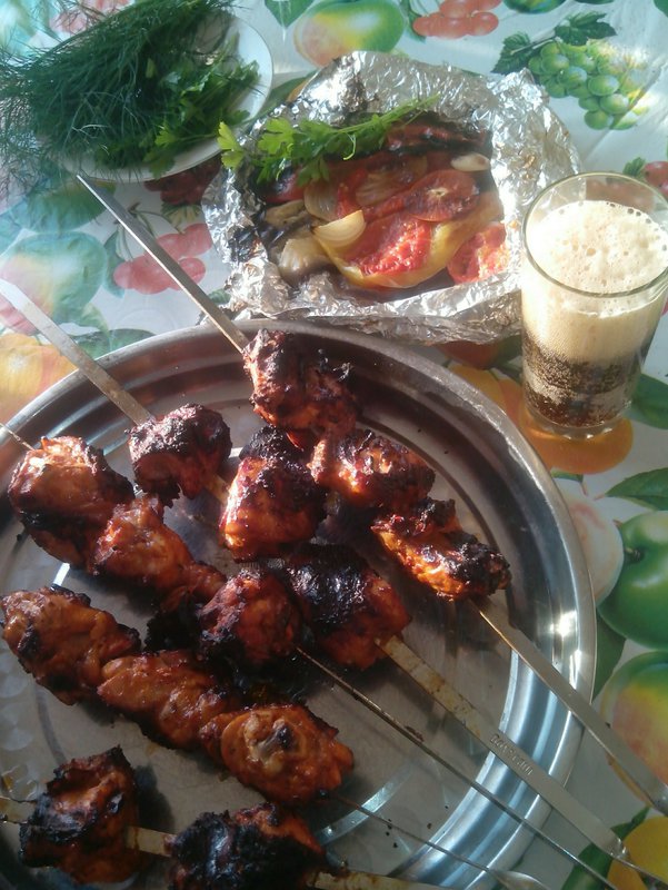 Шашлык из курицы, запечённые овощи в фольге и бокальчик бархатного пива