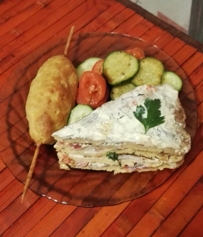 Вместо гарнира овощной салат и кусочек кабачкового торта (испекла блинчики, промазала по очереди сливочным сыром или сметаной с майонезом, чесноком и зеленью, между блинчиками уложила кружочки помидорок, хорошо охладила).