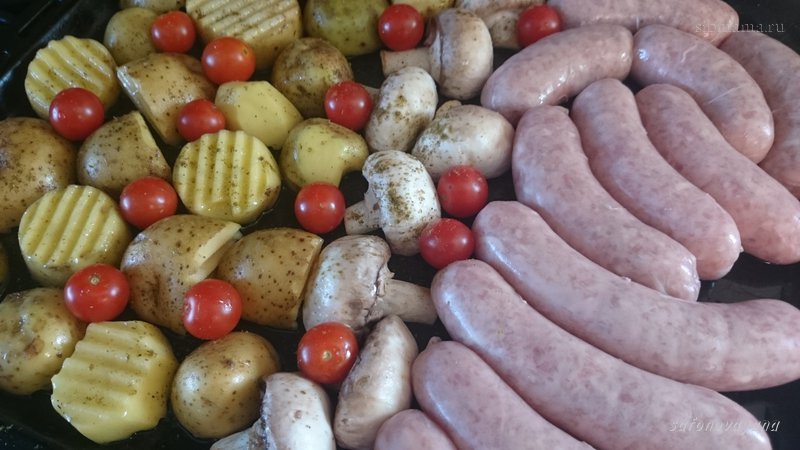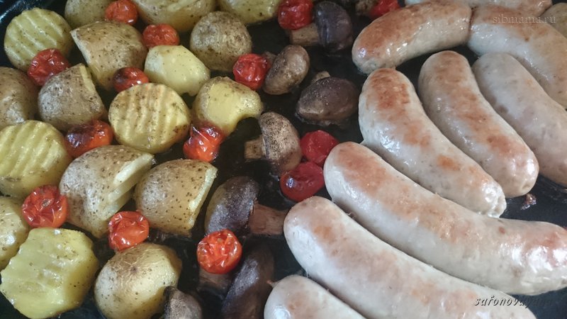 А на ужин колбаски с сыром, картофель, шампиньоны и помидоры запеченные в духовке.