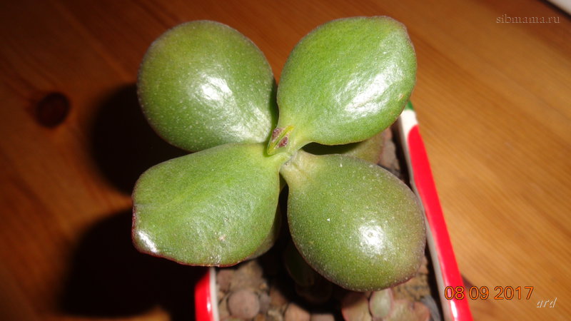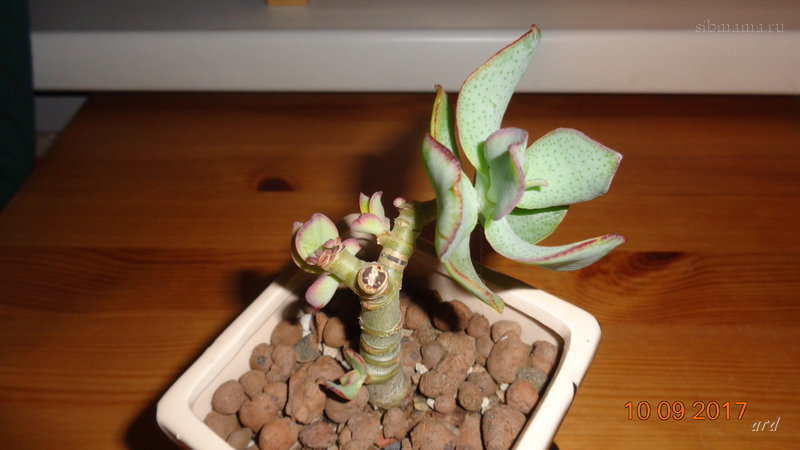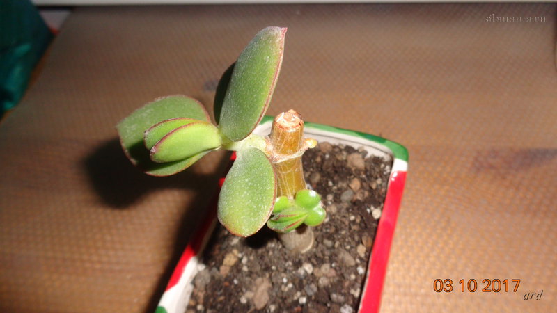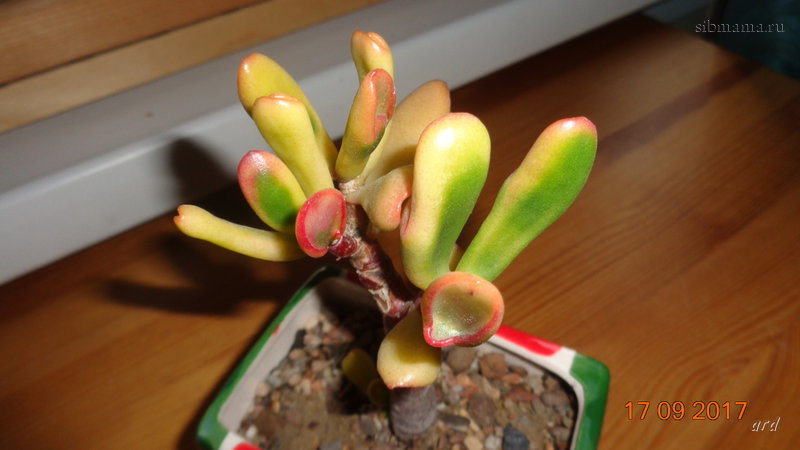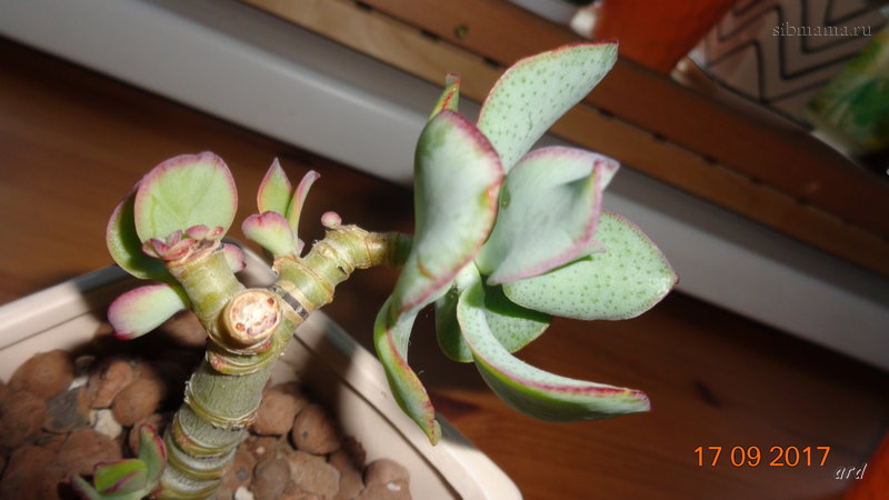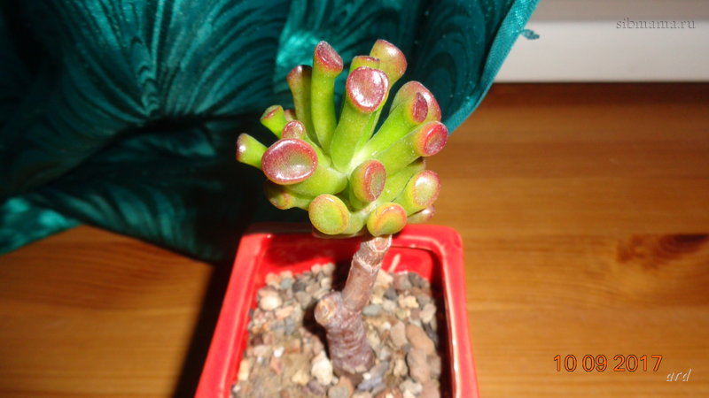 Удаляла у неё не кристатную веточку (укоренила, она так и растёт нормальной). Вместо неё выросли 2 побега, которые целый год тоже были нормальные. Сейчас вижу: они становятся кристатными (правая веточка снизу).
