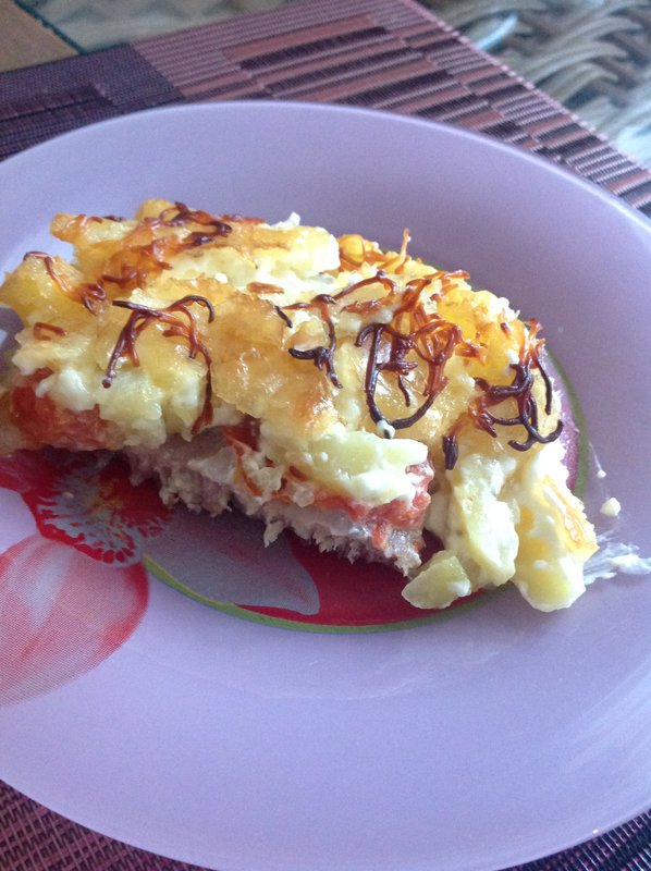 Выложила на лист,сверху лук, помидор,картошечку и майонез ((((