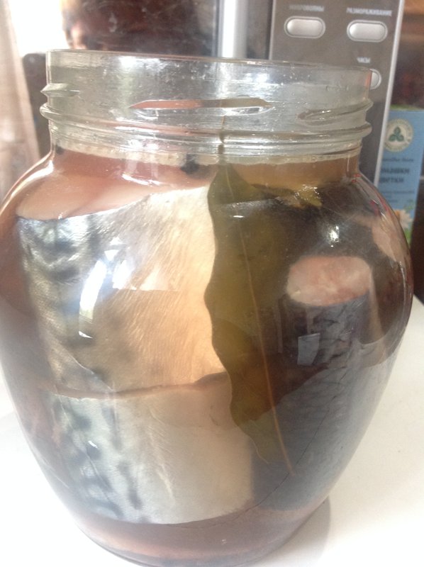 Довожу до кипения,даю остыть и туда очищенную селёдочку или скумбрию,разрезаю примерно на 4 части.