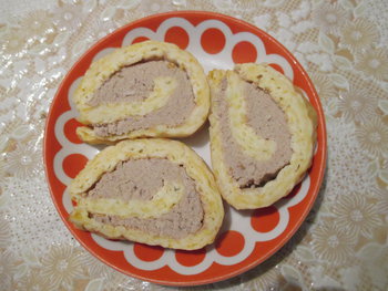 5. Очень быстро смазала корж мясным паштетом и завернула корж в рулет. Осторожно - корж горячий!